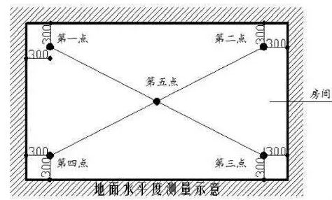指标说明:考虑实际测量的可操作性,选取同一房间找平层地面四个角点和一个中点与同一水平线距离之间极差的最大值作为实测指标,以综合反映同一房间找平层地面水平程度。
