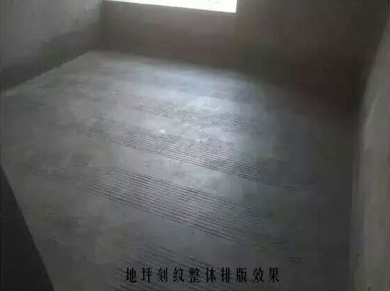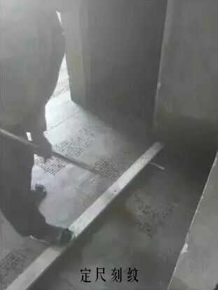 地坪浇筑完成后确保地坪面层刻纹间距统一、纹路顺直,应采用定尺模具进行靠尺刻纹;收面完成后采用刻纹器进行刻纹,两次刻纹之间保持平行,同时保持有200mm宽的收光面不刻纹。在房间四周墙底根部留出100mm的宽度不进行刻纹。