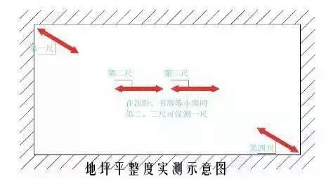 每一个功能房间地面作为1个实测区;任选同一功能房间地面的两个对角区域,按与墙面夹角45义平放靠尺测量2次,加上房间中部区域测量一次,共测量3次,客、餐厅或较大的房间中部区域地面的中部区域需加测一次。同一功能房间内的3或4次地面平整度实测值作为判断该实测指标合格率的3或4个计算点。
